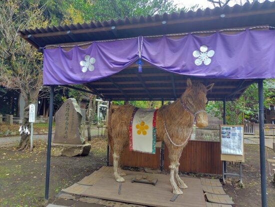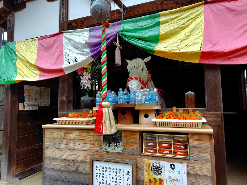 「新田義貞公の白馬で鎌倉攻めの時洪をして戦鎖りて後、この山口観音で余生を送ったものです。勝負する人に験あり」と説明が書かれています。