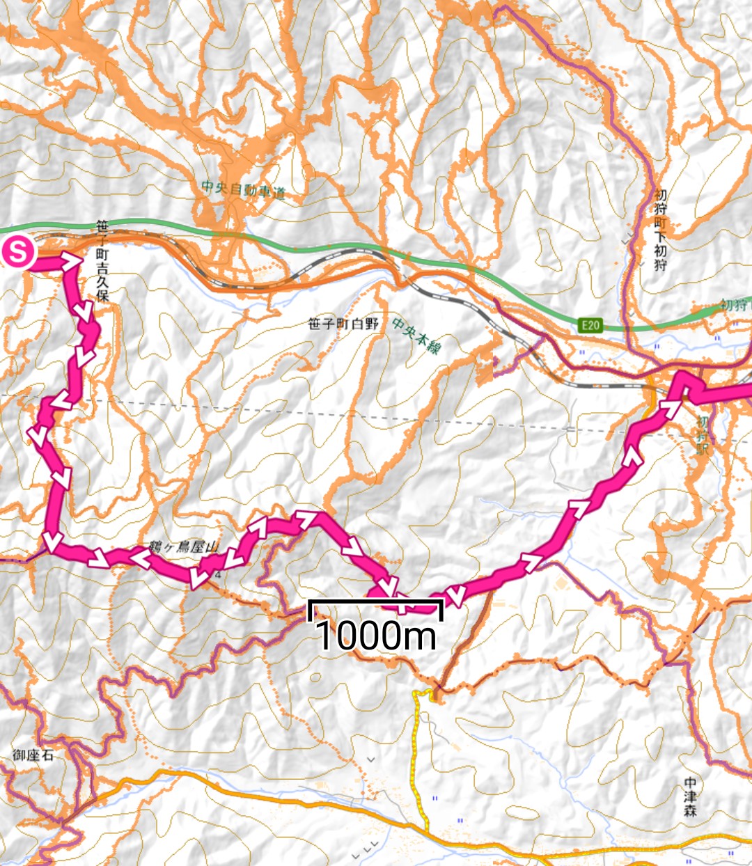 ▼ タイムコース笹子駅スタート9時10分→12時25分鶴ヶ鳥山山頂(昼食)→15時半初狩駅