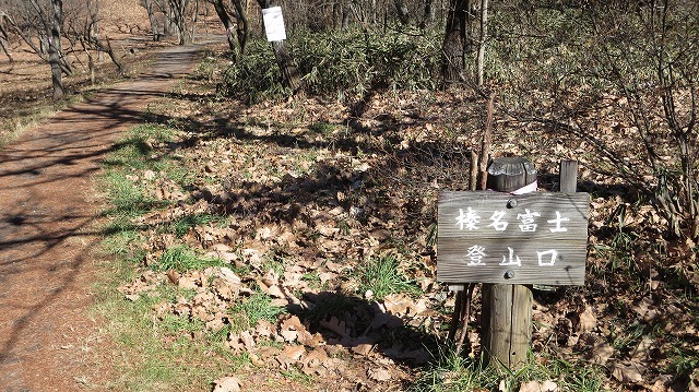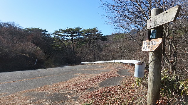 公園を下りて、山道に入りこの広い林道「上野原林道」に出ます。道は狭くなり「水沢山」登山道へ