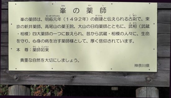 峯の薬師には富田常雄の小説「姿三四郎」で空手の桧垣鉄心と決闘したところです。また境内には明治の政党政治家尾崎行雄(咢堂)の石碑があります。、相模国(神奈川県)津久井群又野村に生まれる。第二次大隈内閣文相、第二次大隈内閣法相等を歴任し憲政の神様と謳われていた。