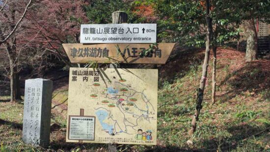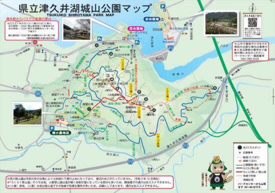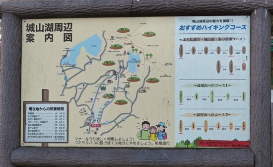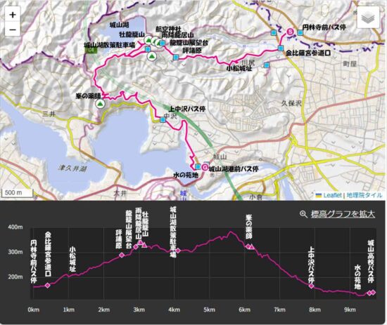 横浜線相原駅=円林寺前バス停9:50→9:56金比羅宮参道口→10:19小松城址→10:45評議原10:51→11:01龍籠山展望台入口→11:08龍籠山展望台→11:30城山湖→11:45城山湖散策駐車場「城山湖コミニティー広場(昼食)」12:25→13:05峯ノ薬師13;17→14:00水の苑地(津久井湖)→14:25城山高校前バス停=橋本駅