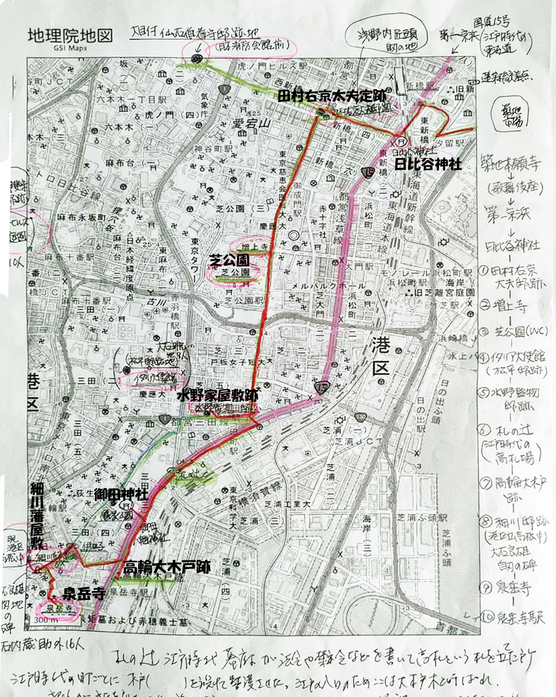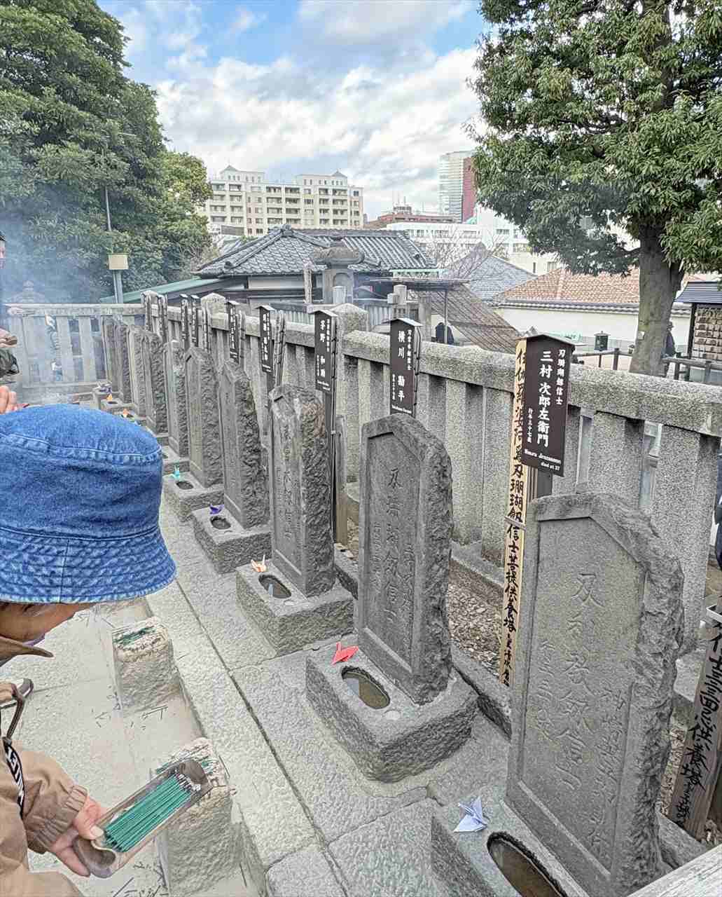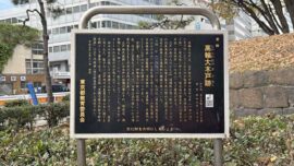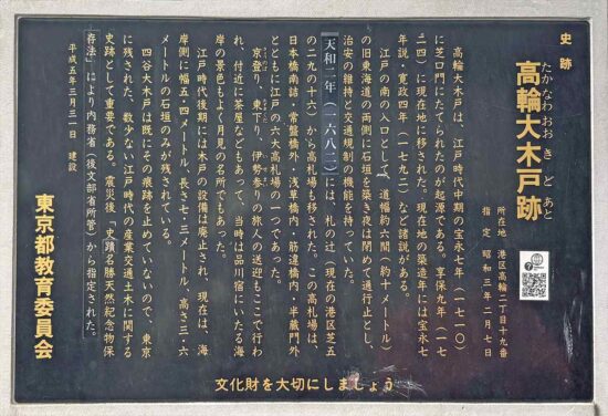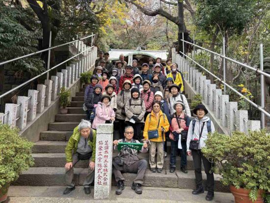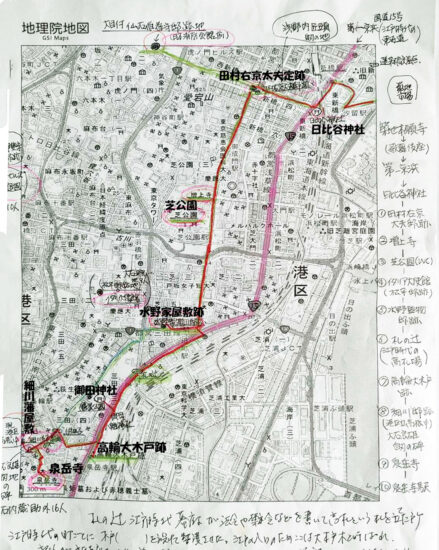 築地駅.築地本願寺中庭10:00→仙台藩上屋敷跡(現日本TV辺)10:39→奥州一ノ関藩田村右京太夫邸跡10:54→11:40芝公園12:20昼食→岡崎藩水野家三田屋敷跡12:40→御田神社13:00→高輪大木戸跡→肥後細川藩下屋敷・忠烈跡13:30→泉岳寺13:50(各自でお詣り)→泉岳寺駅