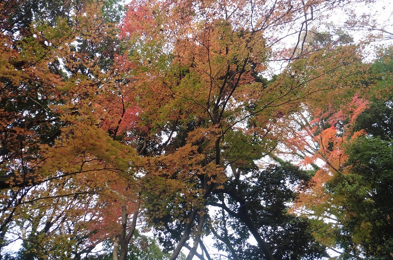 木々が生い茂っています、都会とは思えない大きな森 鮮やかな赤色がまだ楽しめます