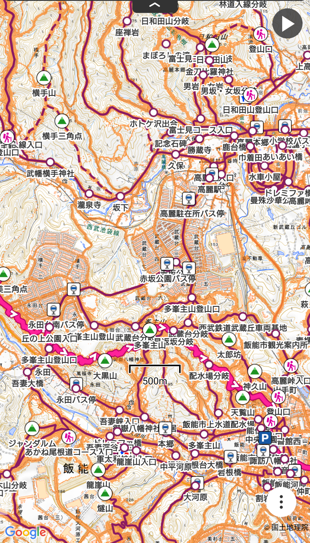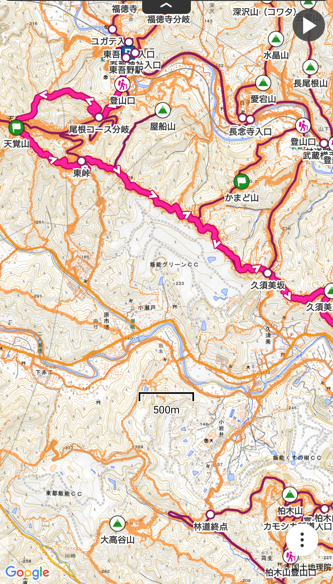 コース :東吾野駅8:30ー9:32天覚山9:45-10:13東峠10:19-久須美峠11:34ー11:44久須美山(昼食)12:12-13:55多峯主山14:02-14:33天覧山14:43-15:22飯能駅