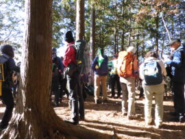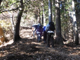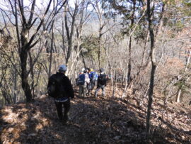 コメント:落葉を踏みしめて歩くには楽しい季節でしたが滑りやすいので落ち葉払いをしながら歩く。コースの中の最高点(602m)コヤシロ山からは素晴らしい眺望で、低山ながら岩場、ヤセ尾根、急登ありの変化に富んだコースで存分に楽しめました。協力者、参加リーダー、参加の皆様には、協力頂き今年度の最後の山行を終える事が出来ました事に感謝します。一年間、有難うございました。来年もどうぞよろしくお願い致します。 佐野 満喜子