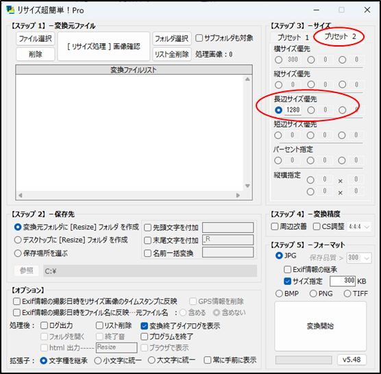 ・「リサイズ超簡単!Pro」を使われている方は古いマニュアルの設定では縦長と横長の写真はそれぞれ別々に変換していたかと思いますが、下記のように設定すると縦長、横長の写真が混ざっていても一回で縮小変換が出来ます。(参考まで)