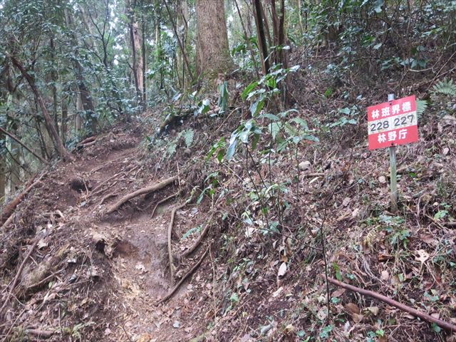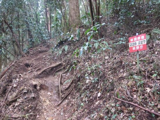 階段を登ると舗装路 右に進むと尾根が落ちこむあたりの山側に取付点。写真の「林班界 林野庁」が目印