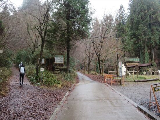 「受付、挨拶」後に出発 右に「キャンプ場」 左の「いろはの森」コースへ入る