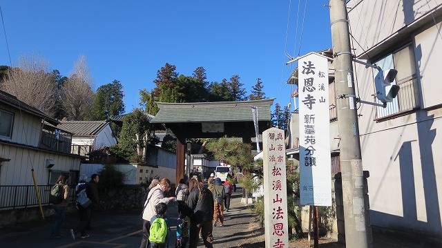 1番目は、恵比寿様の「法恩寺」 越生駅直近で「越生七福神めぐり」の受付場所です。ここで会の受付と「七福神まつり」の参加申込書を提出。コースマップ(福引券付き)と缶バッジ(個数に制限有)をいただく