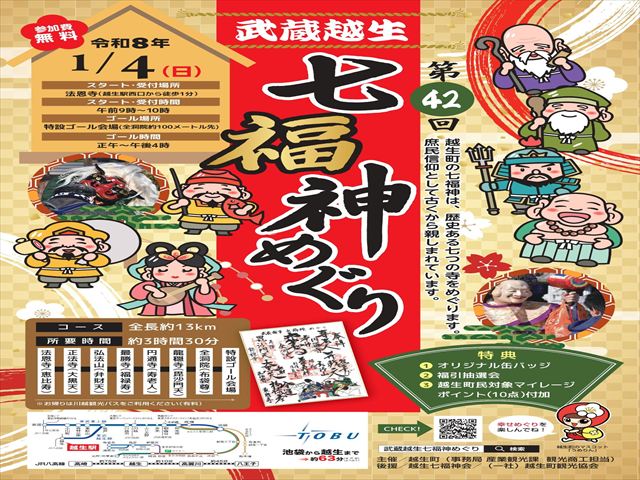 越生駅→松渓山法恩寺(恵比寿)9時55分→正法寺(大黒天)→弘法山(弁財天)→最勝寺(福禄寿)→円通寺(寿老人)→龍穏寺(毘沙門天)→全洞院(布袋尊)→(抽選会)→バス停15時=越生駅