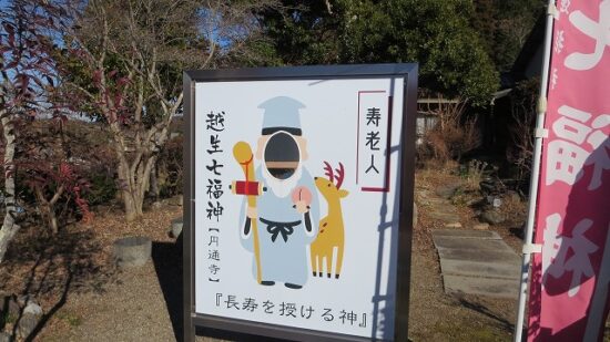 七福神巡りは、七柱の福の神々を祀る寺社を巡り、一年間の幸運を祈願する伝統的な行事です。 この巡りは、地域の歴史や文化に触れながら、健康的なウォーキングとしても楽しむことができます….と言われますが、越生町は室町時代後期に活躍した武将で、江戸城を築いたことで知られています太田道灌の生誕地と言われています(うめその梅の駅では、NHK大河ドラマのへの推薦署名を募っていました)。