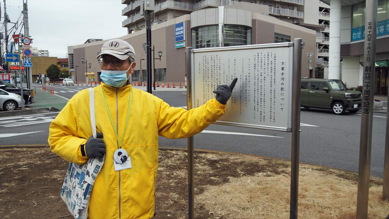 ボランティアガイドが、万葉集東歌の中にある古河の地を詠んだ歌二首について説明