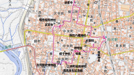 JR宇都宮線古河駅10:11→10:20諏訪八幡神社10:26→10:47徳星寺10:55→福寿稲荷神社11:11→11:16正定寺11:29→三神町稲荷神社11:50~蛭子神社11:02→12:03坂長(休憩等)12:21→神明宮12:30→大聖院12:42→秋葉神社12:47→12:57JR古河駅