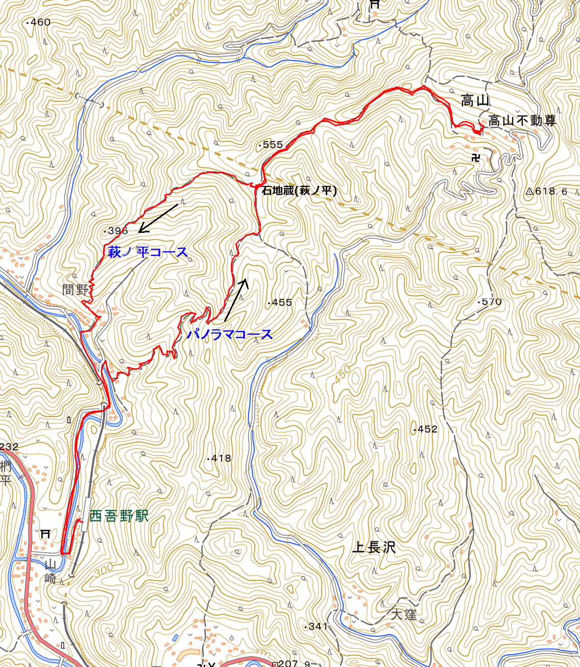 | 「コース案内」 スタート:西吾野駅9:24~(パノラマコース)~石地蔵(萩ノ平)10:55~高山不動尊11:33~石地蔵(萩ノ平)13:00(参拝、昼食)~(萩ノ平コース)~西吾野駅14:02:ゴール。距離:7.5km 、所要時間:4時間38分。 (GPSデータ参照) |