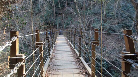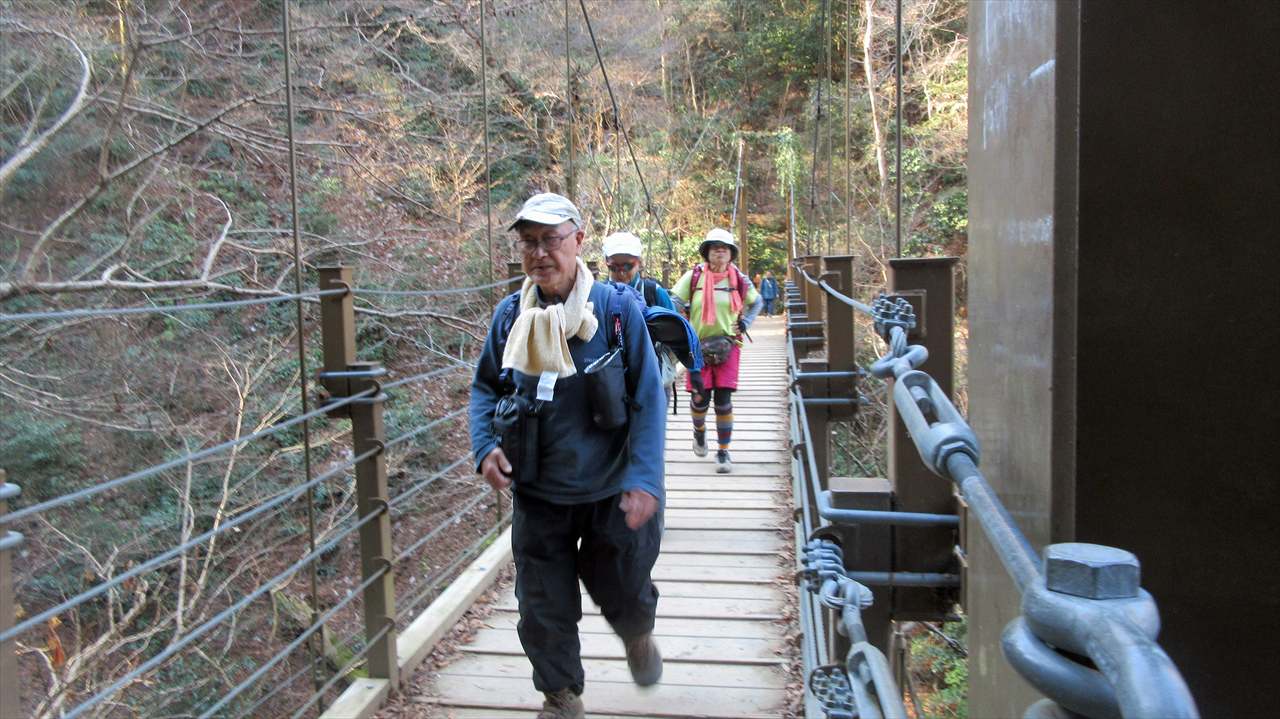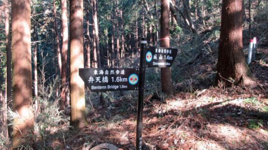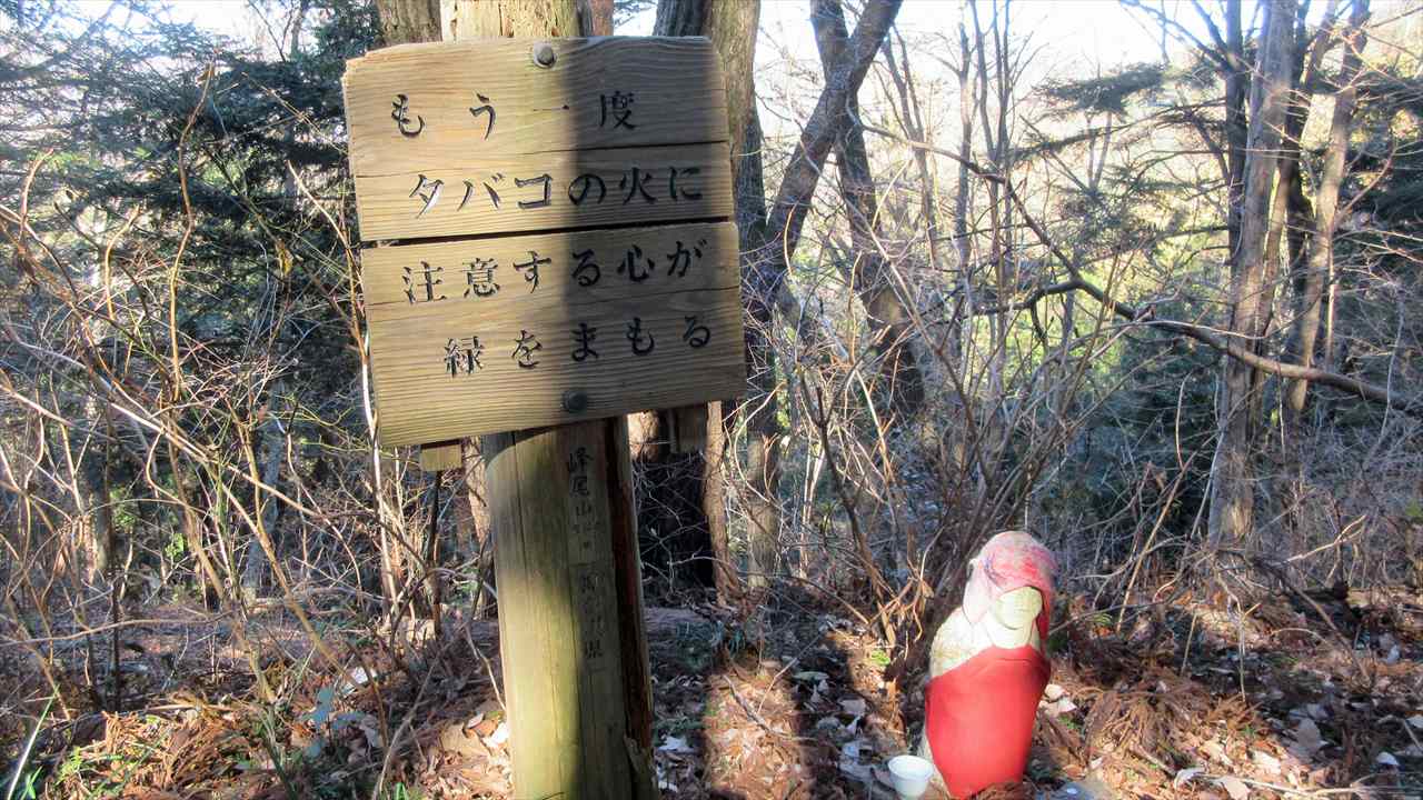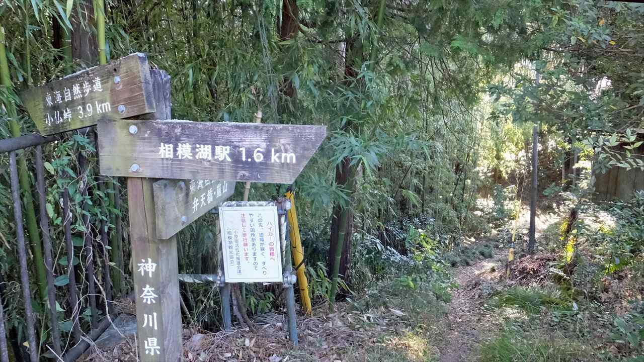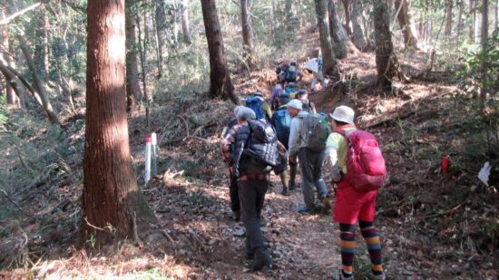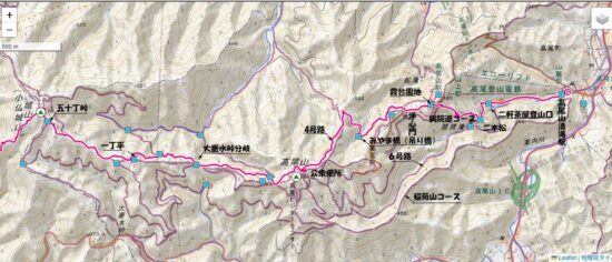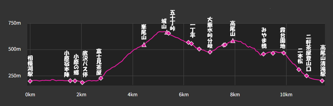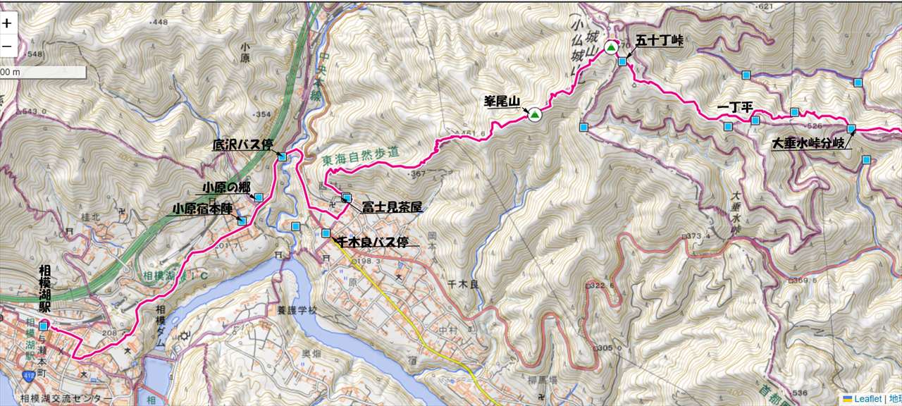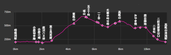JR中央本線相模湖駅9:05→9:55千木良登山口(富士見茶屋)→11:00峯尾山→11:25城山(昼食)12:05→12;20一丁平→12:32大垂水峠(学習の歩道)分岐→12:55高尾山公衆便所前13:05→13;27みやま橋(吊り橋)→13:46霞台園地→病院道コース→14:30高尾山・清滝駅