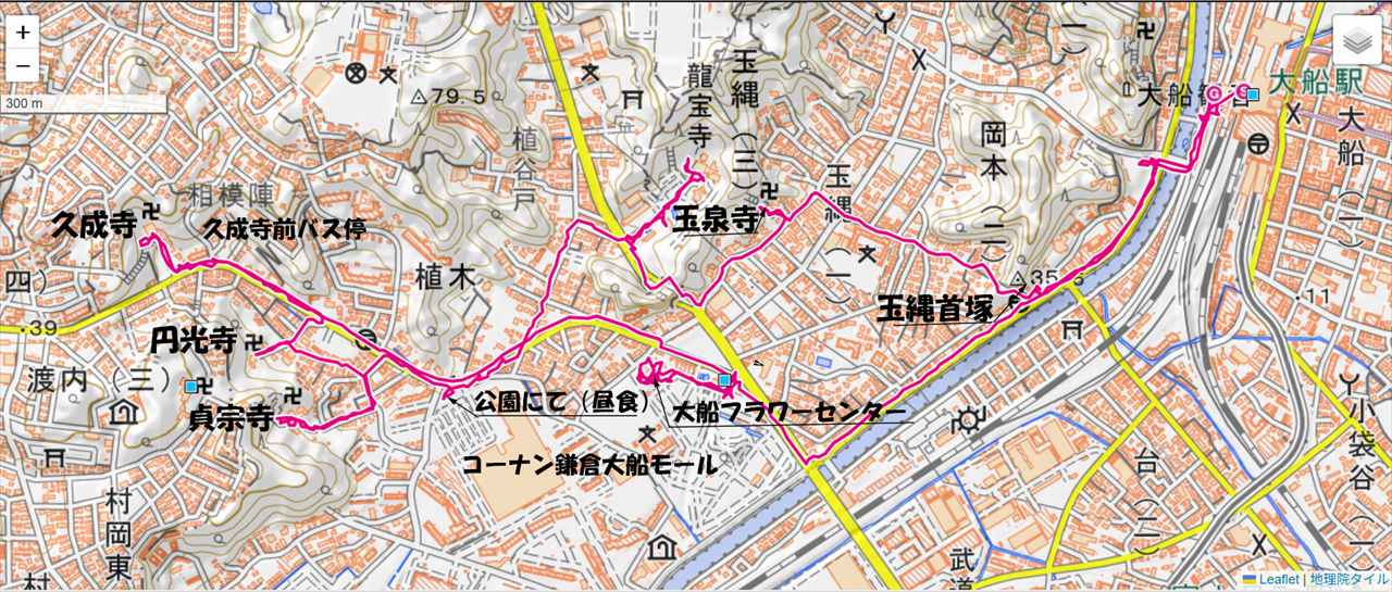 JR東海道本線大船駅10:14→10:24玉縄首塚10:28→10:39玉泉寺10:47→10:57龍宝寺11:21→11:52児童公園にて昼食12:05→12:17貞宗寺12:33→12:39円光寺12:45→久成寺→13:30大船フラワーセンター14:10→14:32大船駅