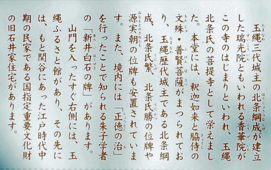 徳川家康が小田原攻めの際に立ち寄って祈祷を頼み、恩賞として三石を与えたといわれ、鷹狩りの折には「葵の紋」入りの弁当箱を授けられたという。 寺には、「鎌倉郡玉縄郷ノ内三石のこと」と書かれた徳川五代将軍綱吉の朱印状が残されている。 境内には、三代将軍源実朝を暗殺した公暁を討ったとされる長尾定景一族の墓がある。 定景は長尾景虎(上杉謙信)の祖先にあたるのだという。