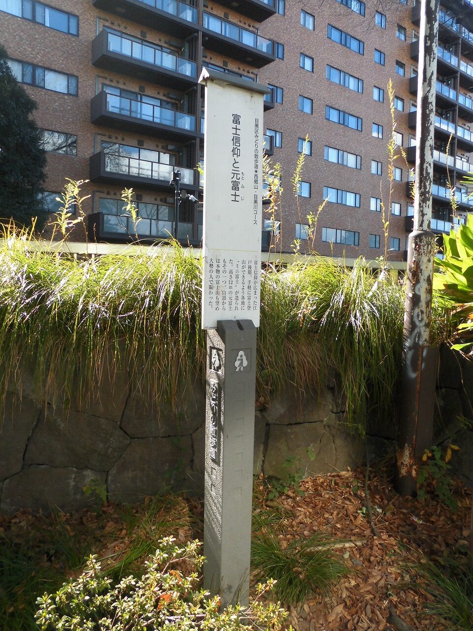 目黒元富士跡(マンションの敷地にあった富士塚は、文化9年(1812)に上目黒の富士講の人々が築いたもので、高さは12mもあったといいます。文政2年(1819)に、別所坂上(中目黒2-1)に新しく富士塚が築かれるとこれを「新富士」と呼び、こちらの富士塚を「元富士」と呼ぶようになりました。)