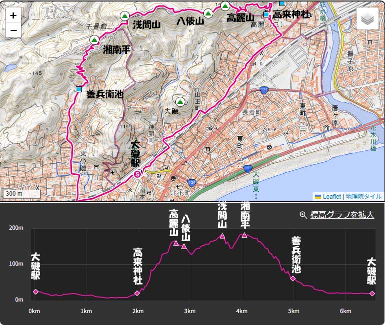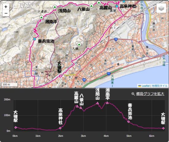JR東海道本線大磯駅10:15→10:45高来神社10:56→高麗山11:20→八俵山11:26→11:43浅間山11:51→12:00湘南平12:37→善兵衛池12:58→13:22大磯駅