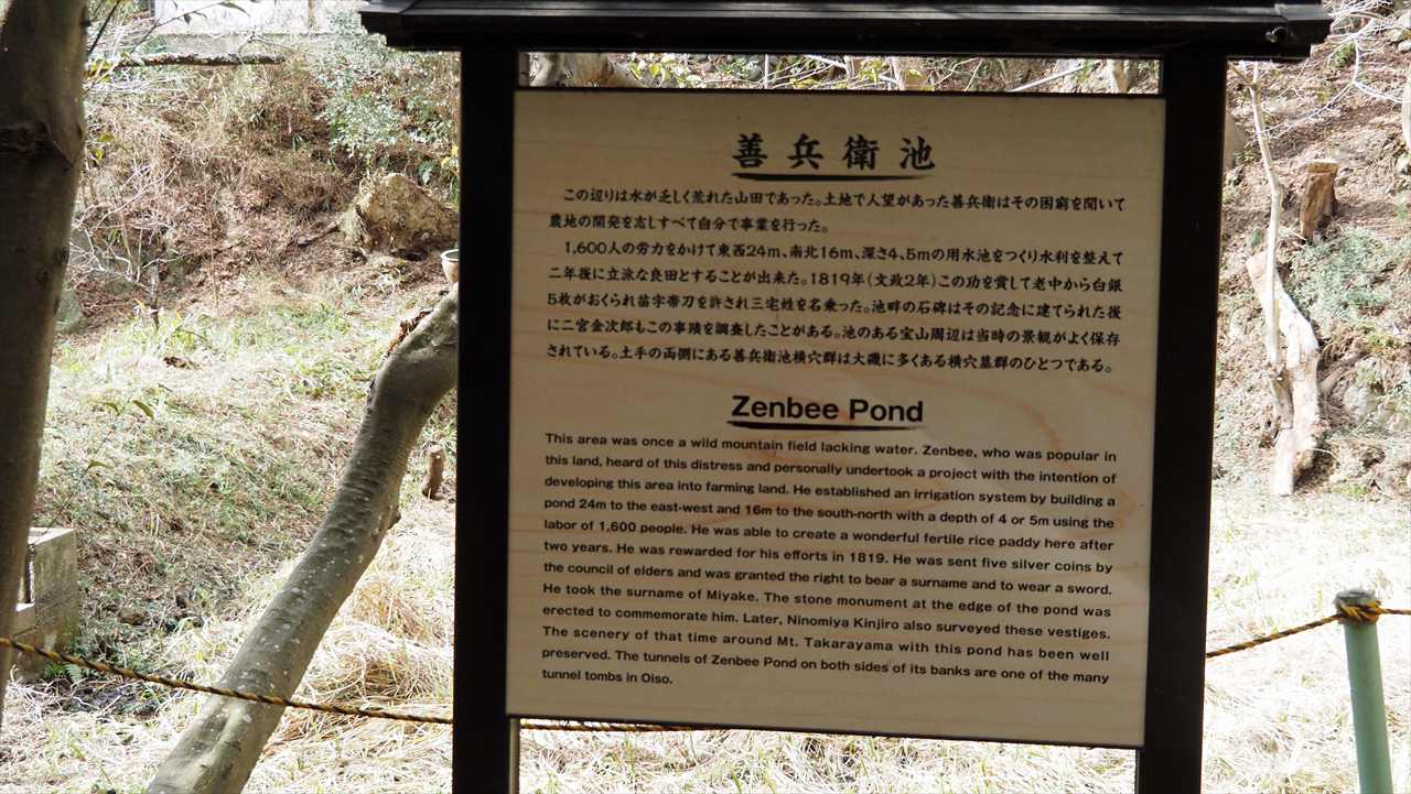 江戸時代、人望の厚かった善兵衛さんが水が乏しかったこの地域のために、自ら先頭に立ってこの溜め池を造り、その功が幕府の老中にも認められ苗字帯刀が許され、三宅性を名乗ったという。