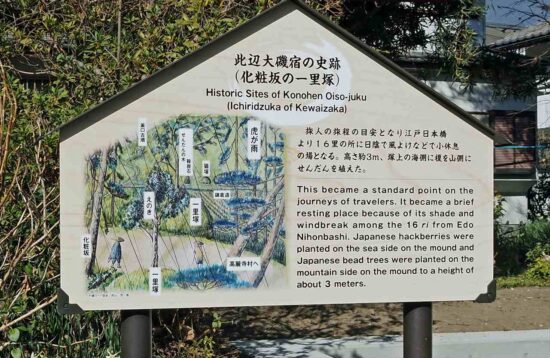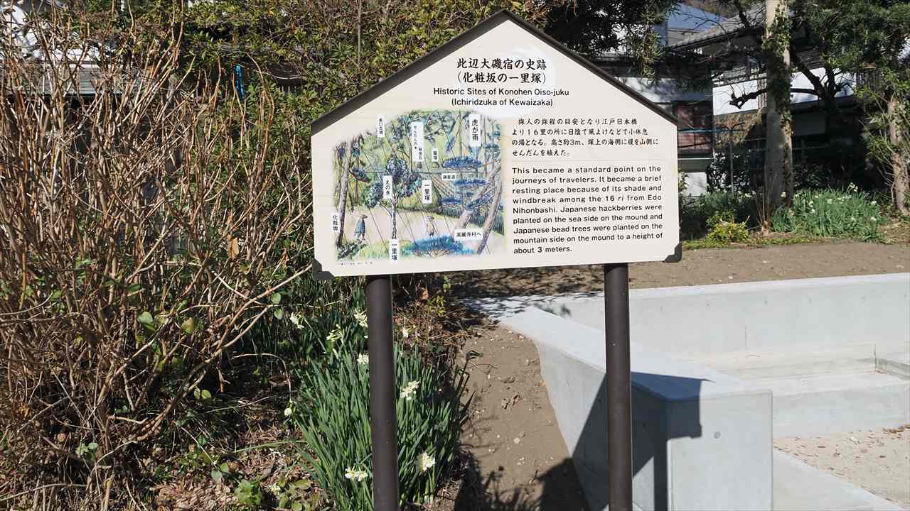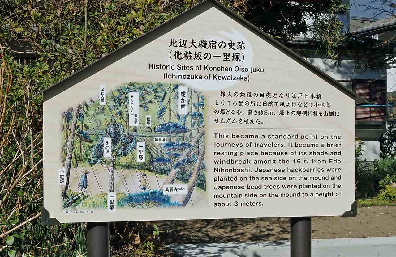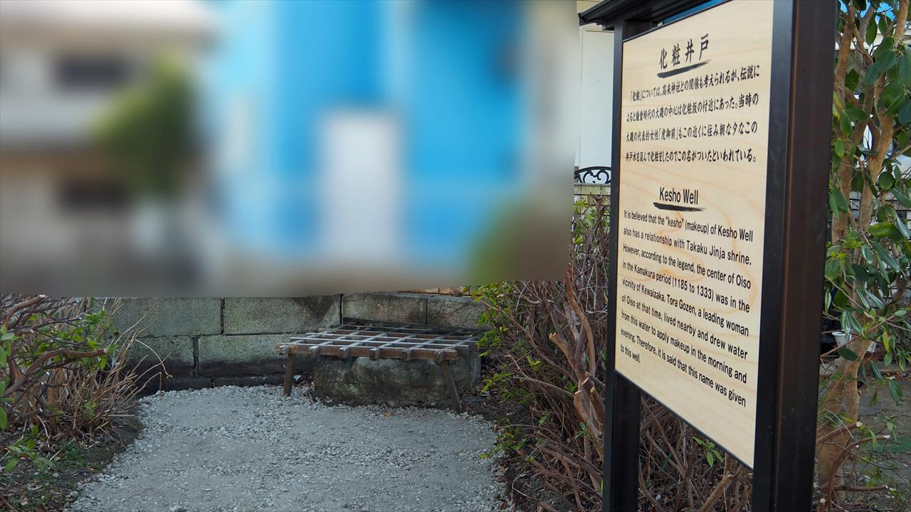 「化粧の井戸」については、高来神社との関係も考えられるが、伝説によると鎌倉時代の大磯の中心は化粧坂付近にあった、当時の大磯の代表的女性「虎御前」もこの近くに住み、朝な夕なこの水を汲んで化粧をしたので、この名が付いたと言われている。説明板より