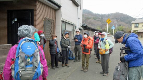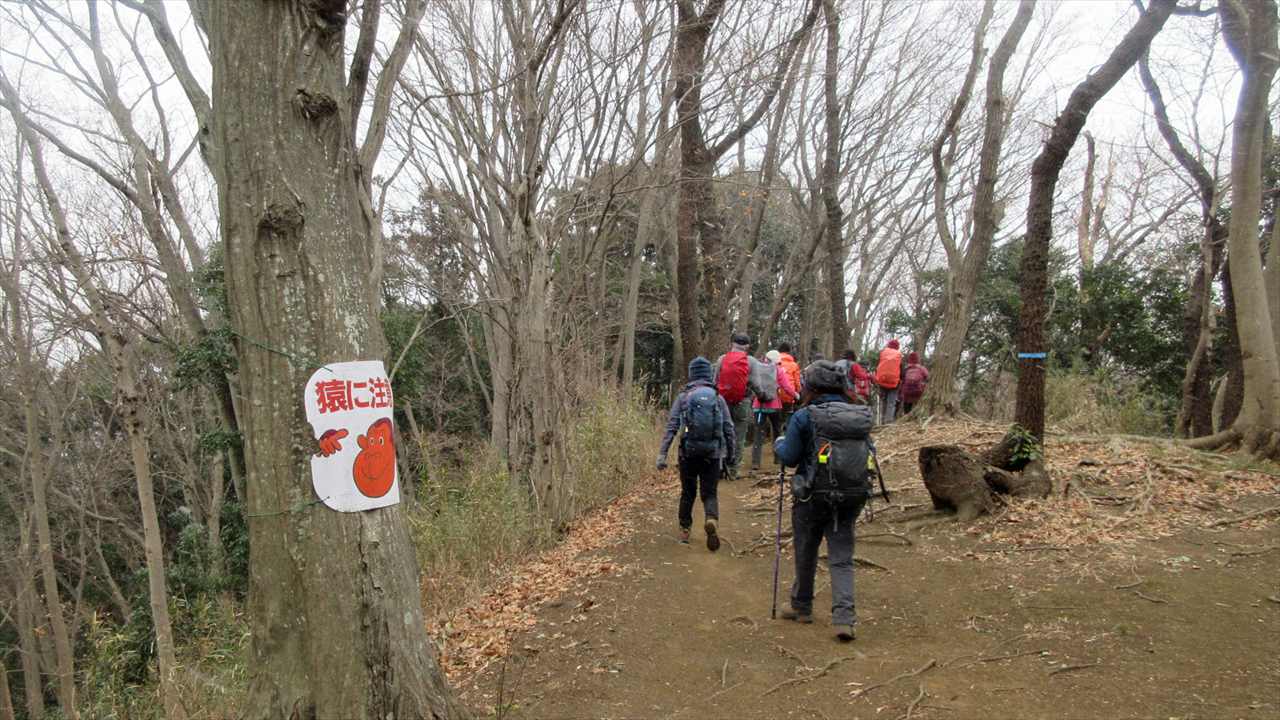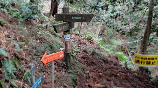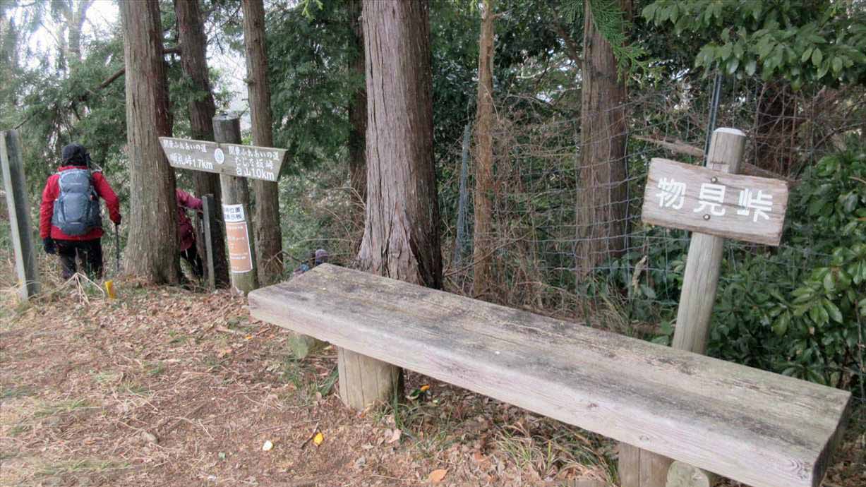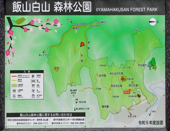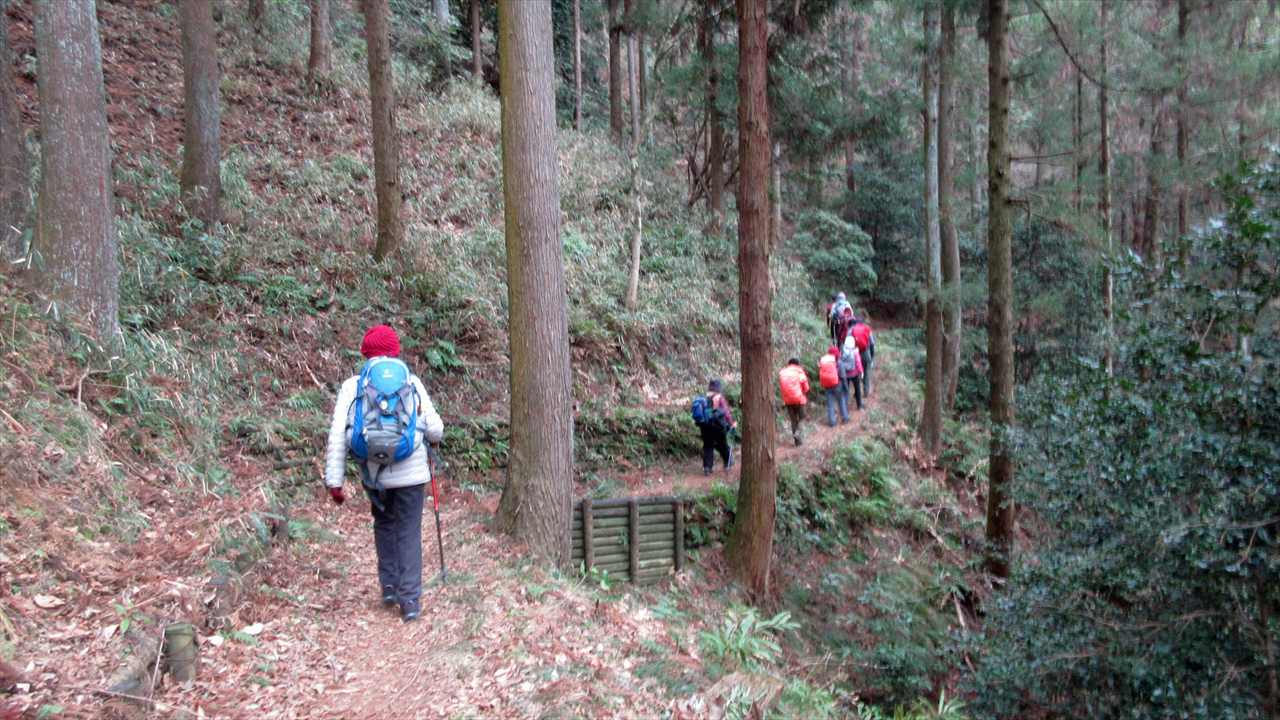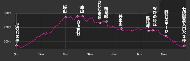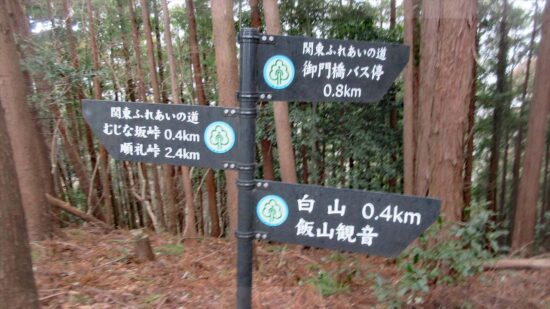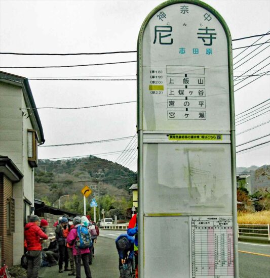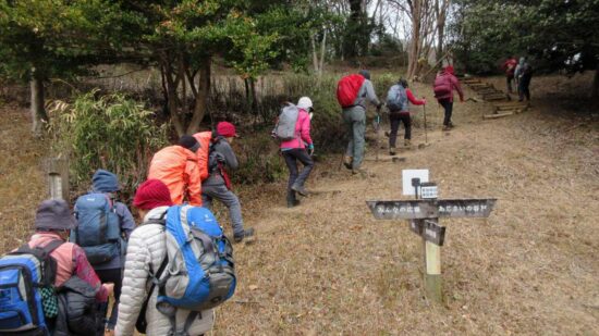 小田急線本厚木駅=尼寺バス停9:55→10:33桜山10:45→白山神社10:58→11:02白山(昼食)11:26→むじな坂峠11:45→物見峠11:50→井出山12:05→巡礼峠12:33→ながめの丘12:37→県立七沢森林公園・野外ステージ12:55→13:05七沢温泉入口バス停=厚木バスセンター