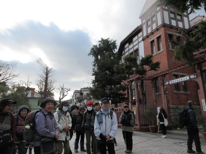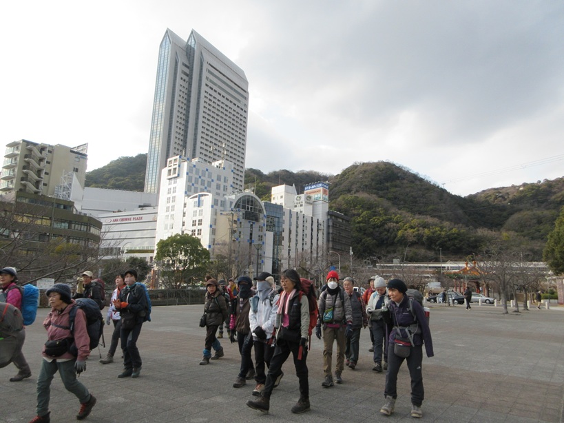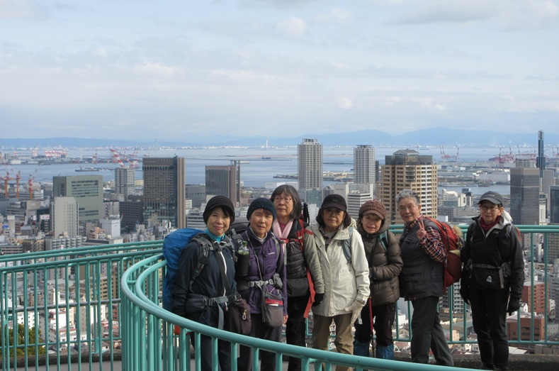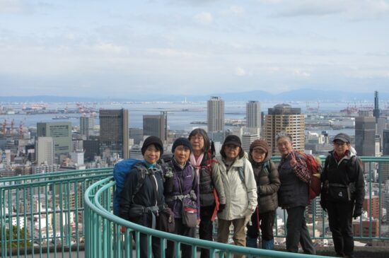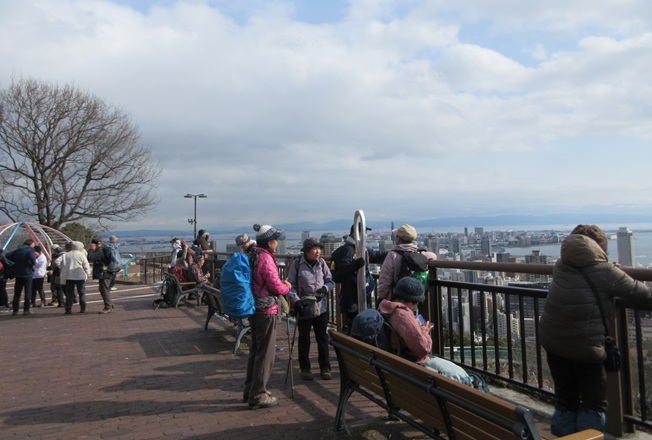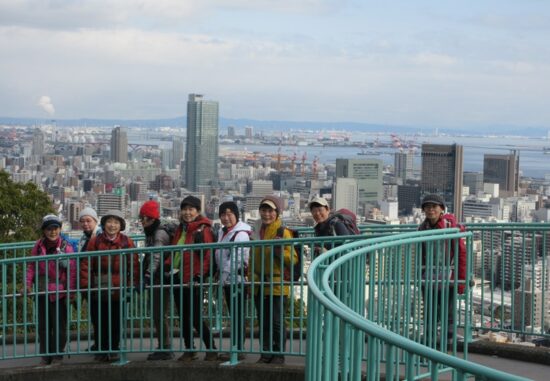 コース:新神戸駅 歩行開始 10:25 → 見晴らし展望台 11:00 → 滝山城址 昼食 11:40-12:10 → 堂徳山 12:55 → 市章山 13:30 → 諏訪山公園 14:10 → 海外移住と文化の交流センター 14:45 →神戸北野異人館街 15:20 → 生田川公園 15:50 → 神戸ユニオンホテル 16:20 (泊)