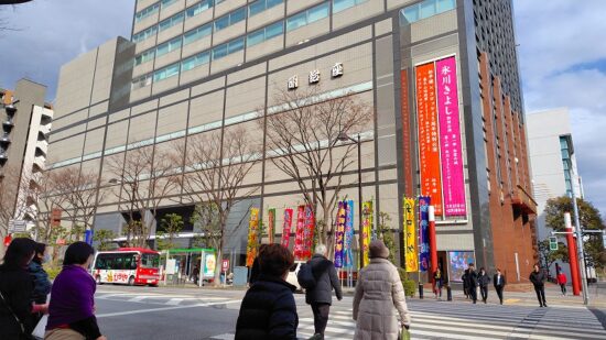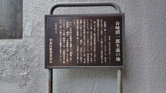 すぐ近くに谷崎潤一郎誕生の地があります。今は案内板だけです。谷崎潤一郎は1886年(明治19年)、祖父が経営するこの場所にあった「谷崎活版所」で生まれました。幼少期は裕福な家庭でした。