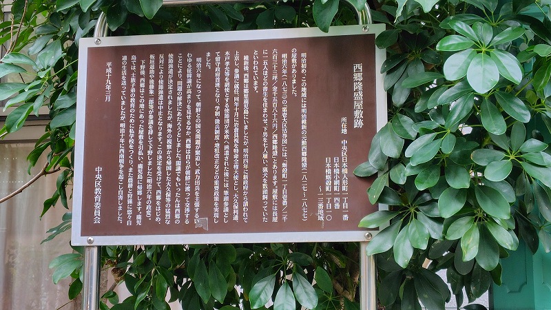 西郷隆盛が住んでいたのは明治4~6年の2年間でした。今は屋敷はなく、日本橋小学校・図書館になっています。