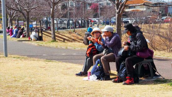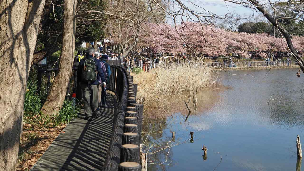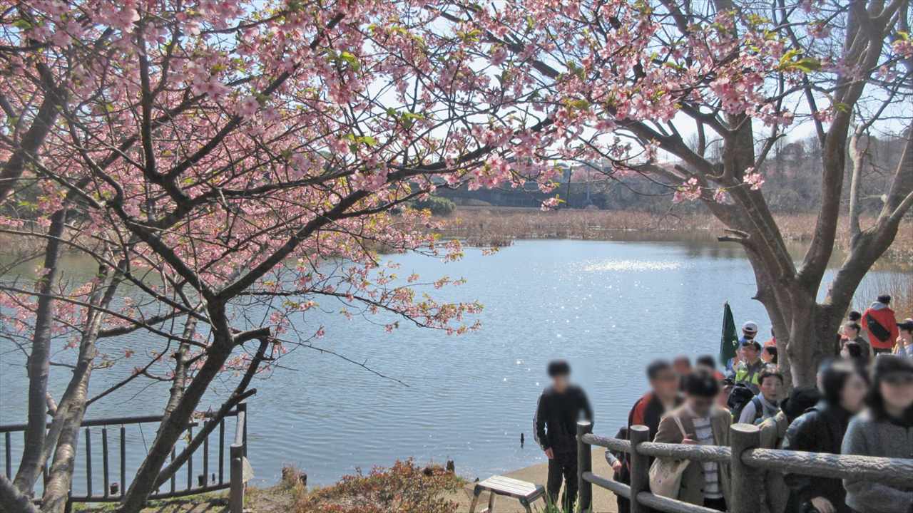 満開を迎えた三浦の河津桜 駅前はすごい混雑です。電車が止まる度に沢山の人達が降りてきます。東ハイの旗を掲げて集合場所に案内する。桜まつり会場の小松池周辺は行き交う人で大変な賑わいでした。広大に広がる大根 キャベツ畑を眺めつつ小網代の森へ向かう。 途中の潮風スポーツ公園にてのんびり昼食を取る。近くに無人の野菜販売所があり取り立ての新鮮な野菜を買い求めました。