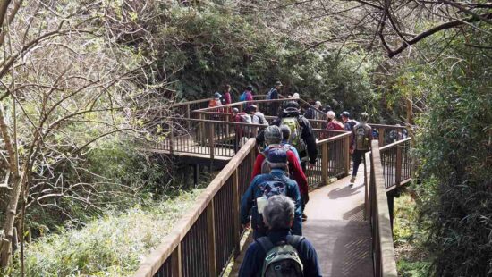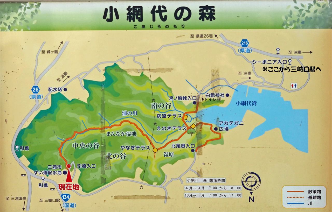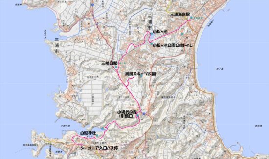 京急三浦海岸駅9:45→三浦桜通り→10:22小松池公園10:45→11:15三崎口駅→11:38潮風スポ-ツ公園(昼食)12:15→小網代の森(引橋口)12:40→13:10えのきテラス13:26~13:42白髭神社→13:55シーボニア入口バス停=三崎口駅