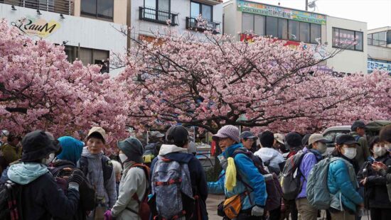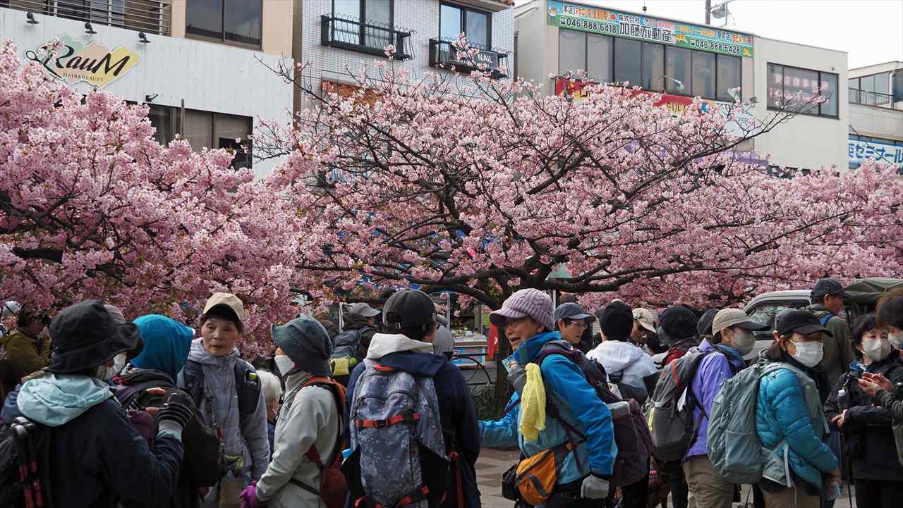 三浦海岸駅前は「三浦海岸桜まつり」見学の人で混雑していた。
