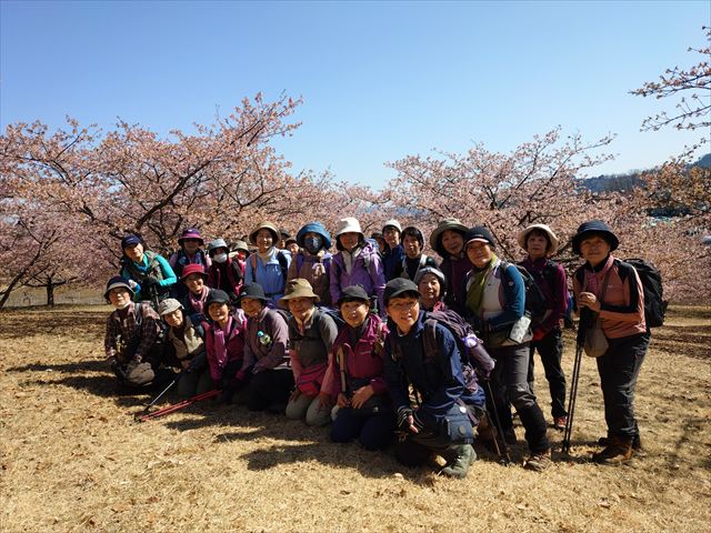 ●リーダーコメント:おおいゆめの里の河津さくらを目的とした山行、その目的は完全に達成できた。今年は天候が穏やかで雨・風で荒れることもなく例年より長く良い景色が見られたことと思います。そんな中に「大井里山花まつり」も開催されていて賑わっていました。桜のあいだから覗く富士山を見ながら、早めの昼食をゆっくり食べ、その後は桜の木々の間を次へと向かった。
