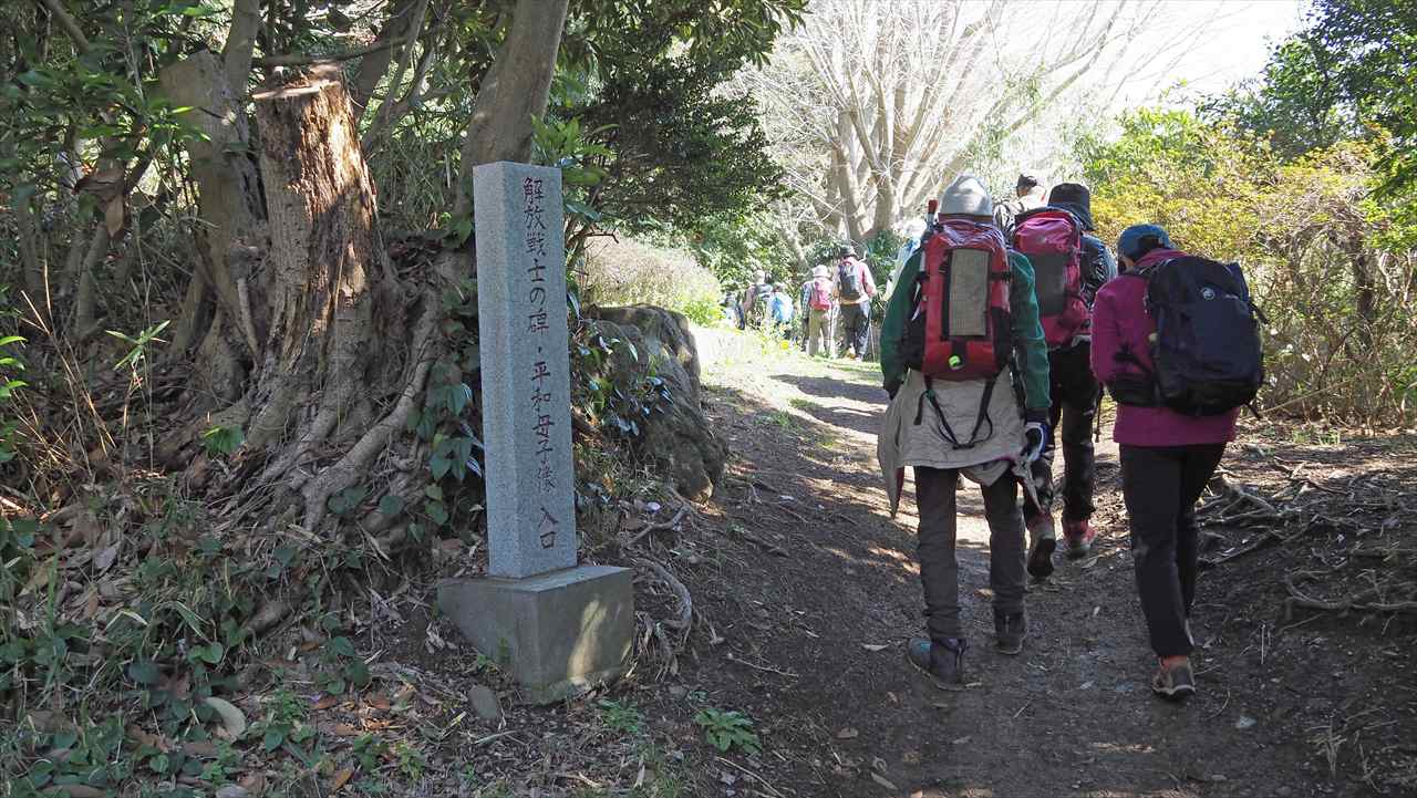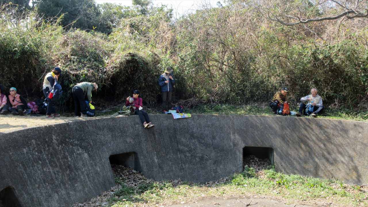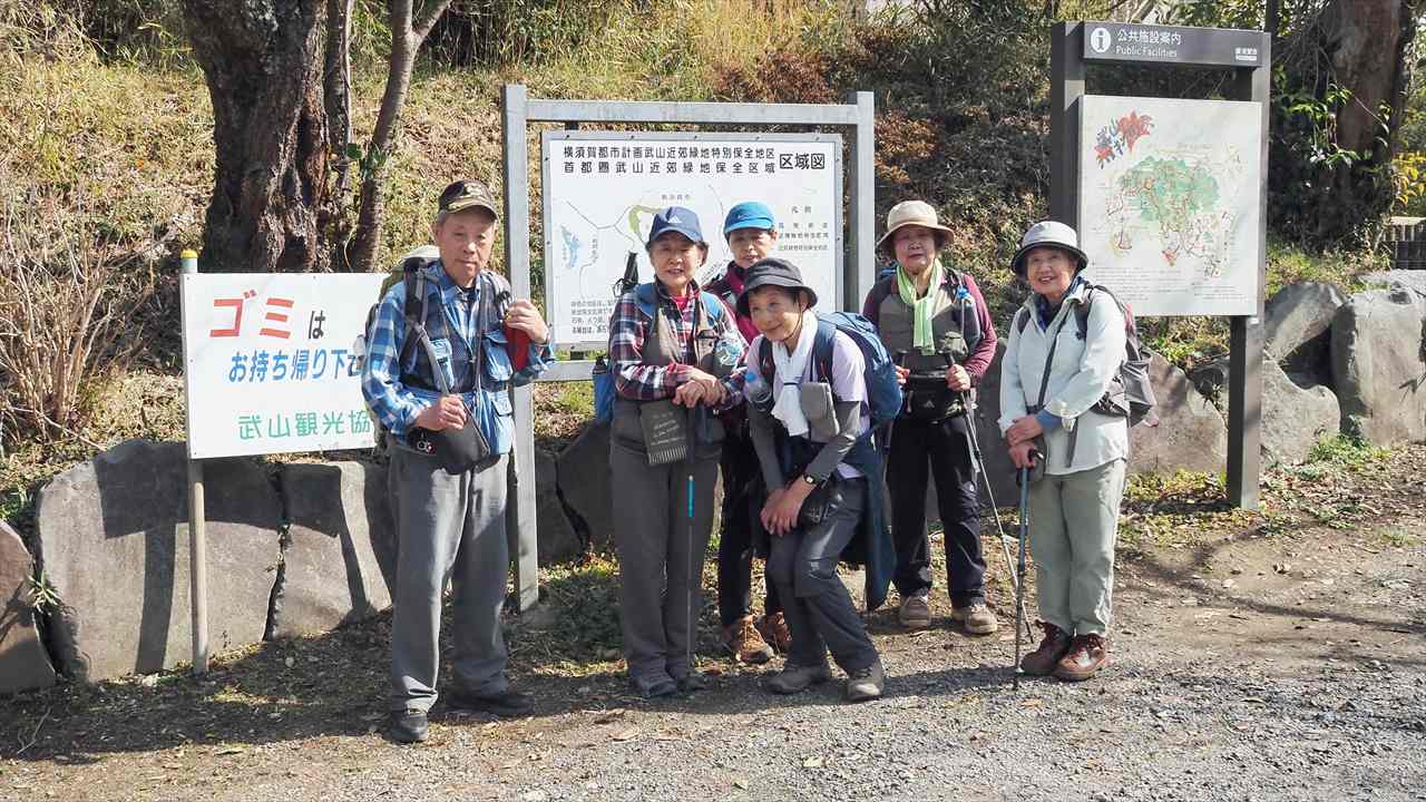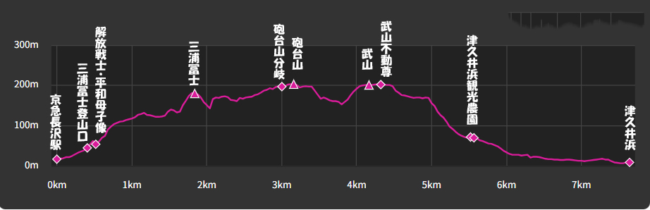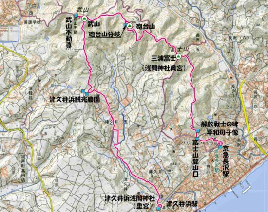 京急本線本線・京急長沢駅10:14→10:21三浦冨士長沢登山口→10:25解放戦士の碑・平和母子像10:28→11:17三浦冨士11:25→11:41砲台山分岐→11:58砲台山(昼食)12:38→13:00武山13:24→13:55津久井浜観光農園案内所14:04→14:28津久井浜駅