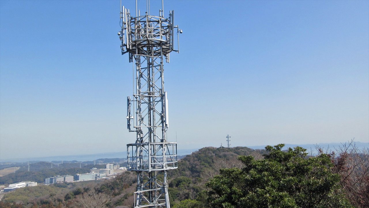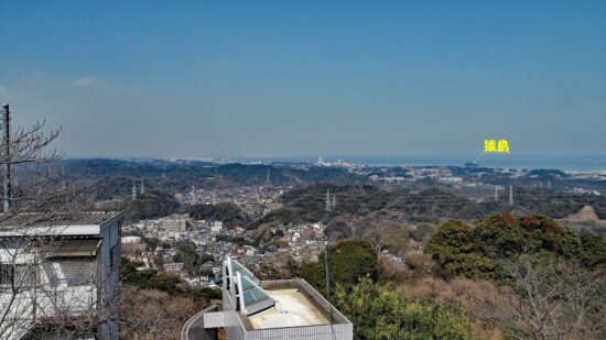 手前の武山山頂のアンテナの右前方に、砲台山の海上保安庁武山受信所のパラボナアンテナが聳えていた。また、左側下にはYRPが見えます。最寄り駅は、YRP野比駅です。