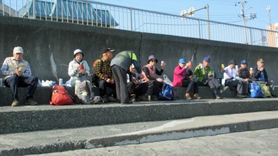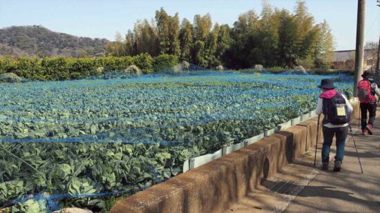 三浦富士、砲台山、武山と三浦の海を展望しながら野菜畑に下り、小川の脇の遊歩道を歩く。津久井浜観光農園や直売所で多くの人が野菜(キャベツ、三浦大根等)を買い求めていた。津久井浜駅で解散。多勢の参加有り難うございました。中嶋 要一