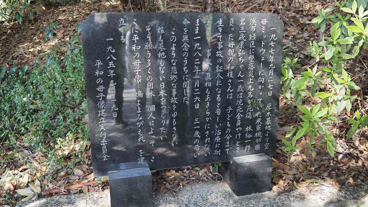 昭和52年9月27日に起こった横浜米軍機墜落事件。このような悲劇をニ度と繰り返さないよう祈りをこめて昭和60年9月29日に建立されたブロンズ像「鳩よよみがえれ」である。