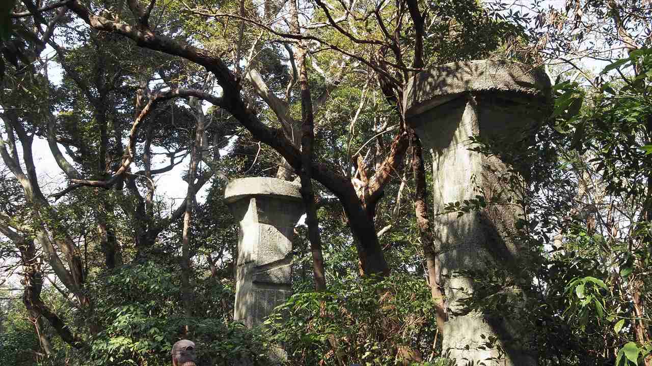 砲台跡に続く道に、サーチライトが取り付けられていたと言われる高さ約4.5mの2本角柱が樹林の中に隠れるように立っていた。