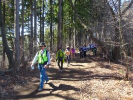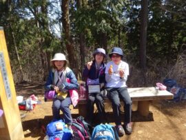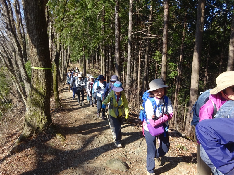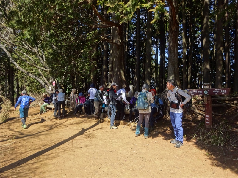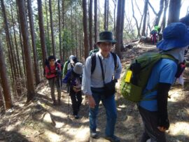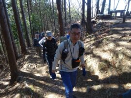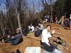 陣馬山は、高尾山から奥多摩の三頭山に続く尾根の中央付近に位置している山で、武田信玄が滝山城を攻めた時に陣を張ったと伝えられることから陣場山→陣馬山と呼ばれるようになったといわれれています。その陣馬山から堂所山、景信山を経て高尾山口駅まで歩くという長いコースを設定しましたが、時間内に無事に下山できるのかとても心配でした。素晴らしいお天気に恵まれたこともありましたが、皆さんしっかりと歩いてくださったおかげで、心配は無用のもので、予定の時間内に下山することができました。陣馬山や景信山のトイレが一つしか使用できず混雑したため、休憩時間を長く設定せざるを得なかったのですが、その分、脚を休ますことができ、景色を眺めて楽しんだり、行動食を摂りながら周りの方と談笑していただくことができ良かったのかなと思いました。