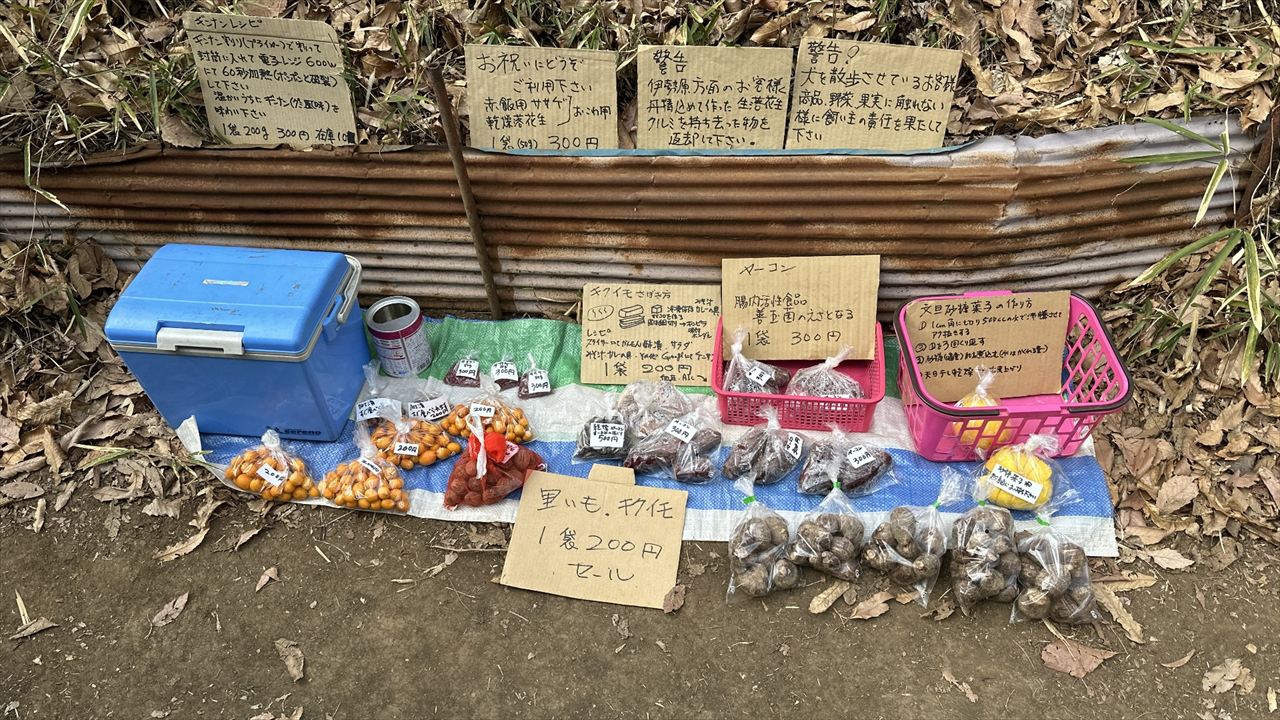 登山道脇の野菜の直売所。たくさんの野菜が並び、作り手の心が伝わってくるようです。