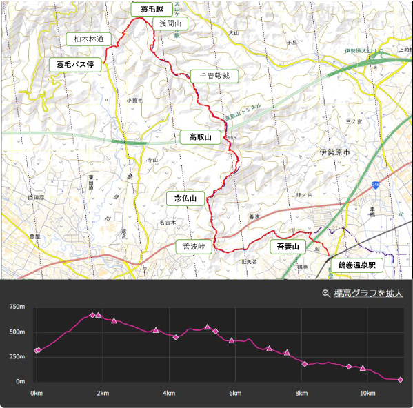 ▼コース : 蓑毛バス停 09:05 – 10:02 蓑毛越 – 10:16 浅間山 – 10:26 無線中継所 – 10:58 不動越(イヨリ峠) – 11:35 高取山(昼食)12:00 – 12:08 聖峰分岐 – 12:56 念仏山 – 13:13 名古木浅間山 – 13:23 善波峠 – 13:55 蛇窪分岐 – 14:00 吾妻山 – 14:23 登山口 – 14:30 鶴巻温泉駅(解散)