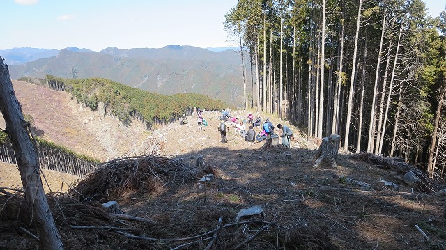 伐採作業中の「三室山」 風はやや冷たく陽の当たる伐採地で昼食