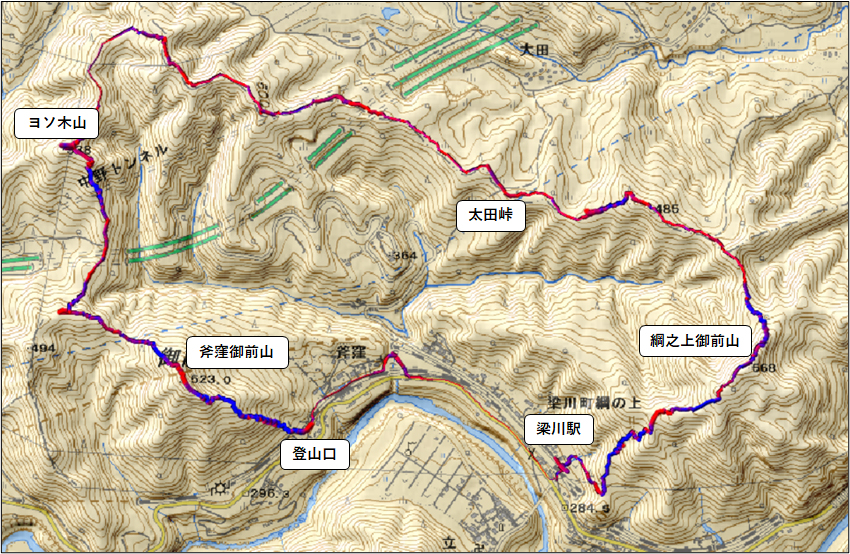 ▼コース : 梁川駅 09:35 – 10:00 斧窪御前山登山口 – 10:37 斧窪御前山 – 11:45 ヨソ木山(538m) 〔昼食〕 – 13:23 大田峠 – 14:30 綱之上御前山 – 15:12 梁川駅