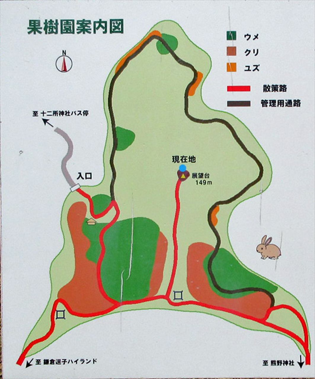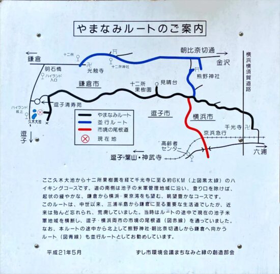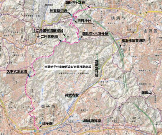 JR鎌倉駅=朝比奈バス停10:50→11:14熊野神社11:21→11:58朝比奈・六浦分岐→12:15十二所果樹園展望台13:00→13:06十二所果樹園→14:07久木大池→14:50JR逗子駅