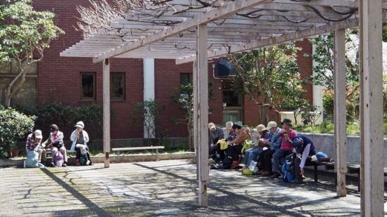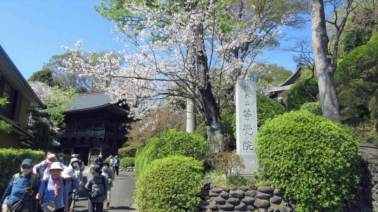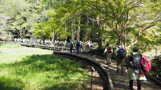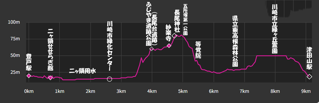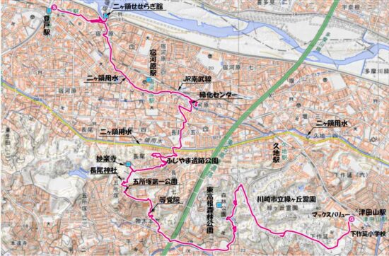 JR南武線登戸駅10:10→10:19二ヶ領せせらぎ館10:33→二ヶ領用水→11:10緑化センター(昼食)11:46→12:14ふじやま遺跡公園(集合写真)12:21→12:28妙楽寺12:30→12:38長尾神社12:41→12:57等覚院→13:18東高根森林公園13:52→13:56緑ヶ丘霊園~14:20津田山駅