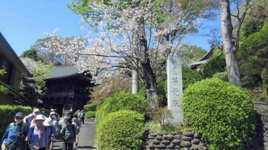 等覚院は、「つつじ寺」の名で知られるツツジの名所で、4月中旬になると約2,000株のツツジの花が一斉に咲き始めます。朱色のキリシマツツジを中心に、オオムラサキの白やピンクなど色とりどりのツツジの花が、石段の両脇や境内の斜面を埋め尽くします。