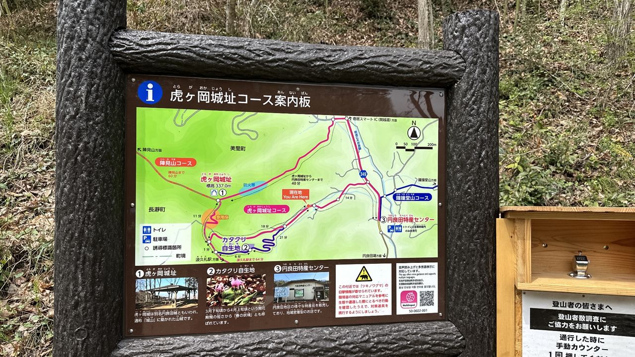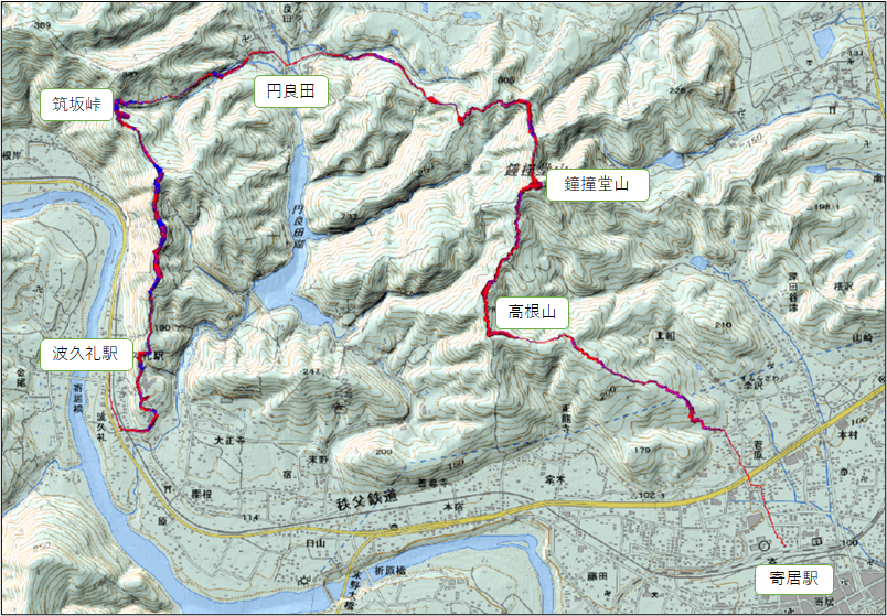 ▼コース : 波久礼駅 09:30 – 09:57 三角点波久礼 – 11:00 カタクリ群生地(ピストン) – 11:11 筑坂峠 – 11:28 円良田城山ハイキングコース入口 – 12:16 鐘撞堂山 – 13:20 高根山 – 14:00 寄居駅