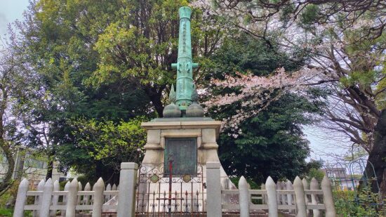 徳丸ヶ原で西洋砲術の調練をおこなった高島秋帆(たかしましゅうはん)の碑が建っています。松月院は調練時に本陣としていました。高島平の地名は高島秋帆が由来です。