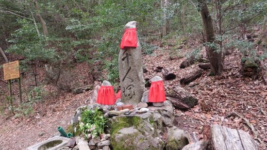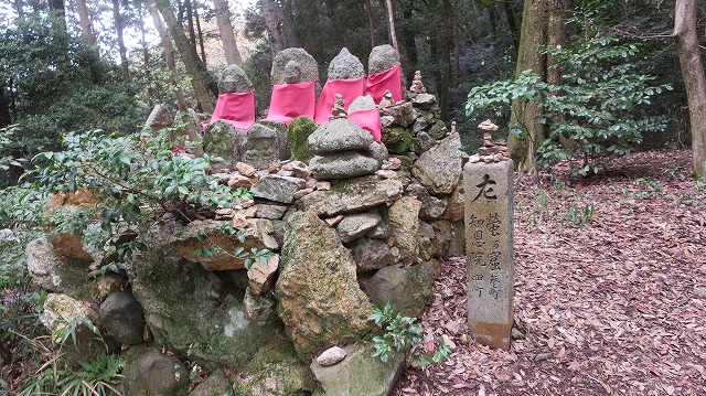 赤い前掛けをした数体のお地蔵様とその傍らに立つ古い石碑。
