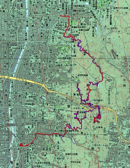 亀岡駅=東山駅→知恩院→㉒円山→㉓長楽寺山→㉕東大谷山→㉑華頂山→㉙清水山→清水寺→㉚清閑寺山→㉛阿弥陀ヶ峰→剣神社→東福寺駅=亀岡駅